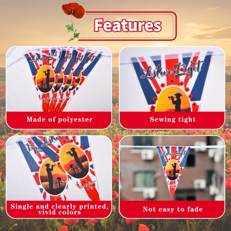 - 🌸WIDELY USING OF POPPY DECORATIONS : poppy day flags bunting is perfect to decorate the front of house for Remembrance, also can be used for street decorations, church, school, garden. The lest we forget bunting will be best flag around your neighbourhood. This will Fly on November 11th as a final flag in honour of your ancestors and their sacrifices.