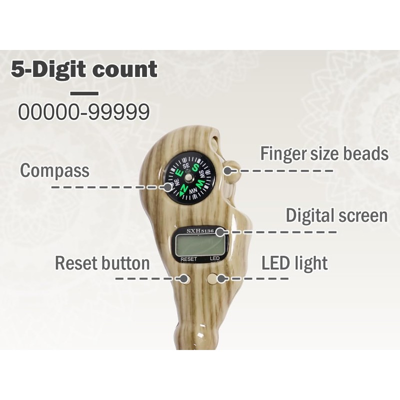 - 📿 Practical Design: Digital beads counter has 3 wood grain colors. Digital-tasbih counter with LED lights, which make you see the count-number clearly whenever day or night. Prayer Beads Counter with compass that can let you find prayer direction easily.