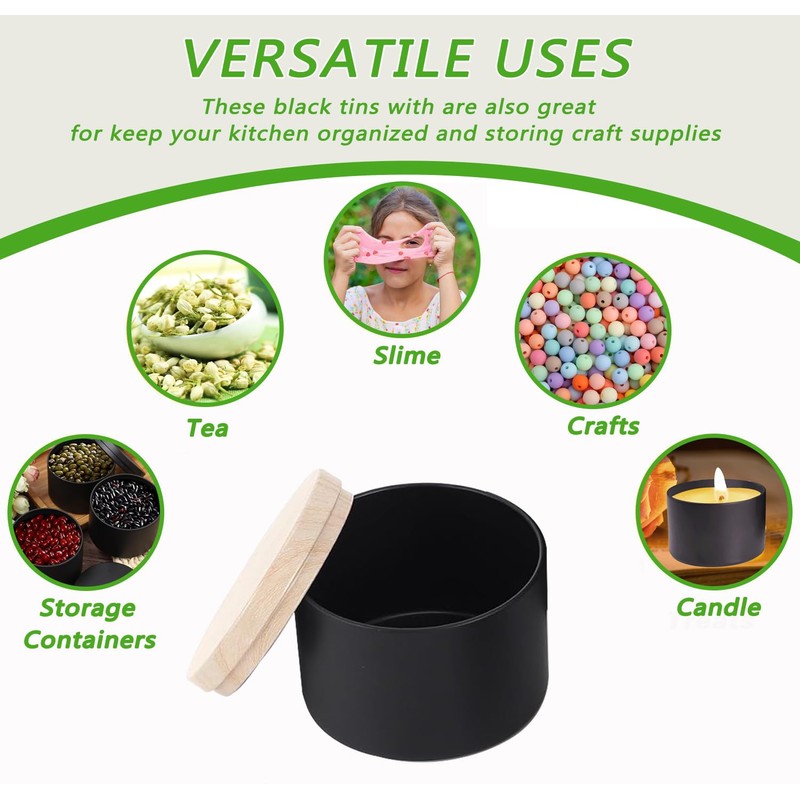- 【Dimensions & Capacity】:2.58" (Diameter) x 2.05" (Height) black round metal candle tin. Capacity: 4 oz = 118 ml, One pack includes 24 tins 4 oz black tins with wood-grain lids.The black tins are heat-resistant, strong, hard to break, and reusable.