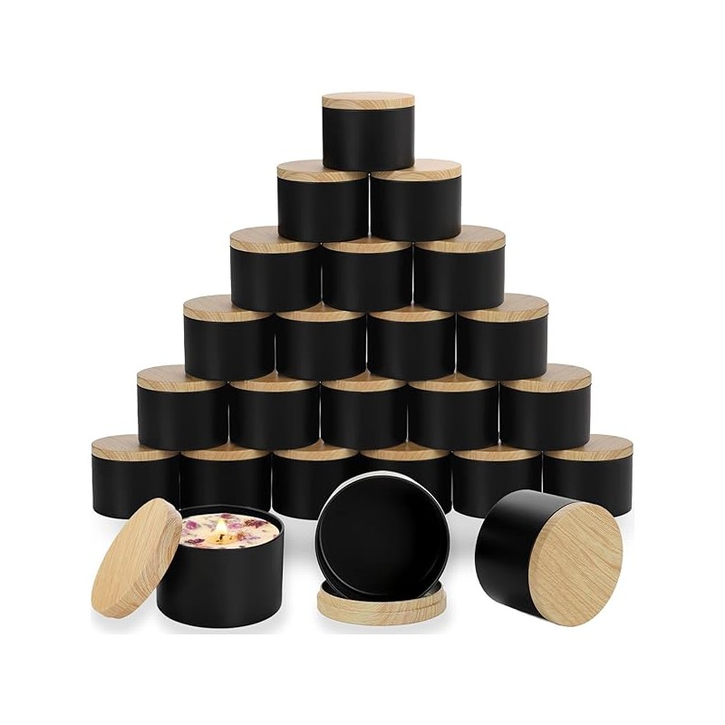 ABK 24PCS 4oz Black Candle Tins With Wood Grain Lids, Matte Jars for Candle Making, Empty Metal Container