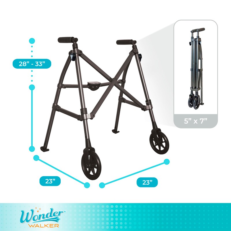 - Narrow and Stylish Design: When open, the walker's compact 24 by 24 inch footprint allows you to maneuver through tight hallways, door frames, and bathrooms; when folded, the walker is self-standing and has a footprint measuring 5 by 7 inches