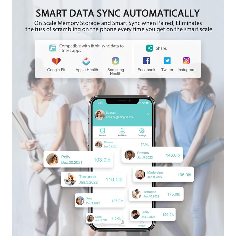 - 6.Multiple User Profiles:The "Fitdays" APP allows for unlimited user accounts,each holding up to 24 member profiles.It's smart enough to automatically recognize who steps on,each user will receive the data on their own devices conveniently,which allows for seamless tracking of your family's health.Use guest mode for a non-recorded check-in or baby mode to track your baby or pet's weight growth conveniently,the athlete mode provides more accurate measurements for professional athletes.