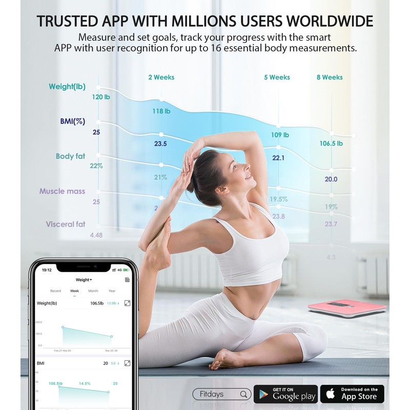 - 4.Syncs with Fitdays APP & Fitness APPs:Download "Fitdays" app on Mobile App Stores.The pink weight scale syncs the data onto your smartphone automatically via Bluetooth 5.0 BLE.The app provides detailed charts and trends of 16 body composition metrics over days,weeks,months or even years.It can also syncs data to Fitness APPs and share to soical media, which means you can track & manage your health or share your achievements with friends anytime, anywhere.