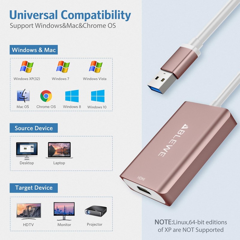 • 【Great Compatibility】This USB 3.0 to HDMI works with great compatibility, suitable for Windows 11/10/8/8.1/7/Vista/XP and Mac OS and Chrome OS, Note: DO NOT support Linux.ABLEWE provides a 12-month warranty and lifetime technical support for this item, For any issue, please contact us to solve it.