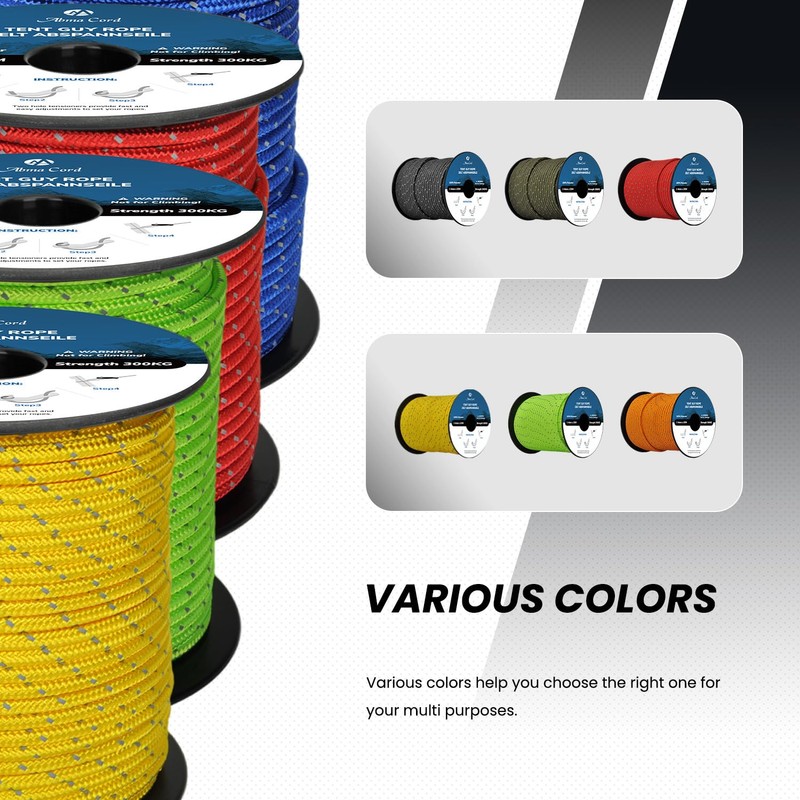 - Excellent abrasion resistance: this tent guy ropes are made of high-strength and abrasion-resistant polyester materials for low stretch. Resistant to UV rays, mildew and rot, the colour does not bleed. The outer sheath structure made of 16/1 braided polyester provides reliable support for your tent.
