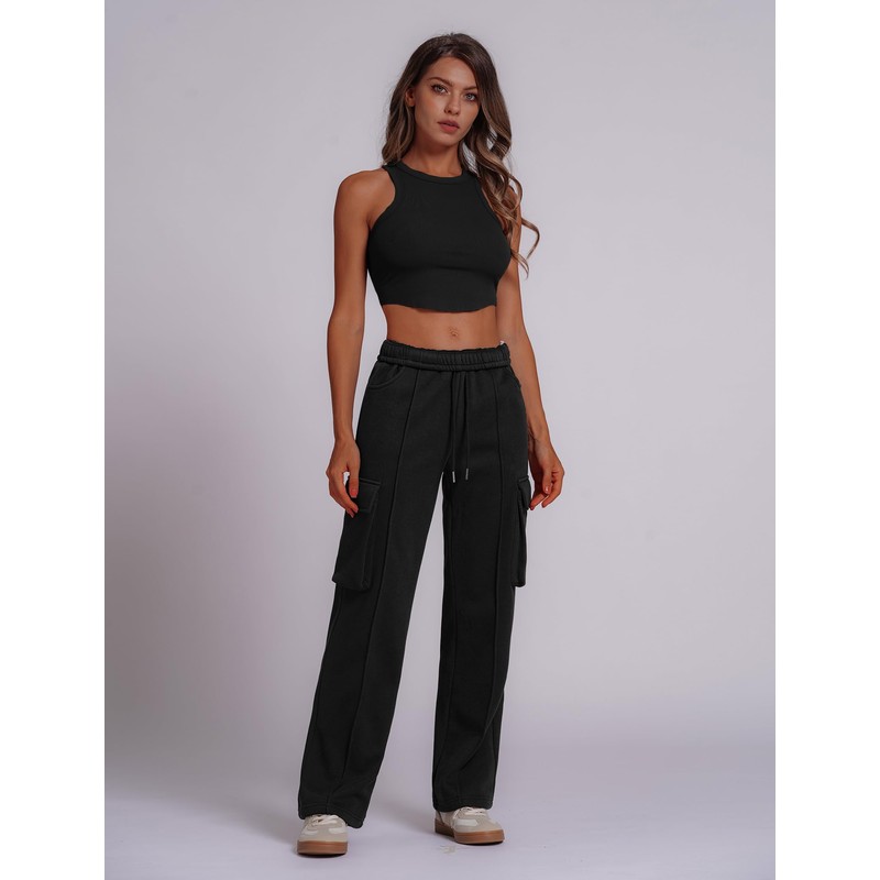 ABOCIW Womens Cargo Sweatpants Drawstring High Waisted Fleece Wide Leg Joggers Sweats Pants Casual Loose Athletic Lounge Trousers with Pockets Cargo Black Large