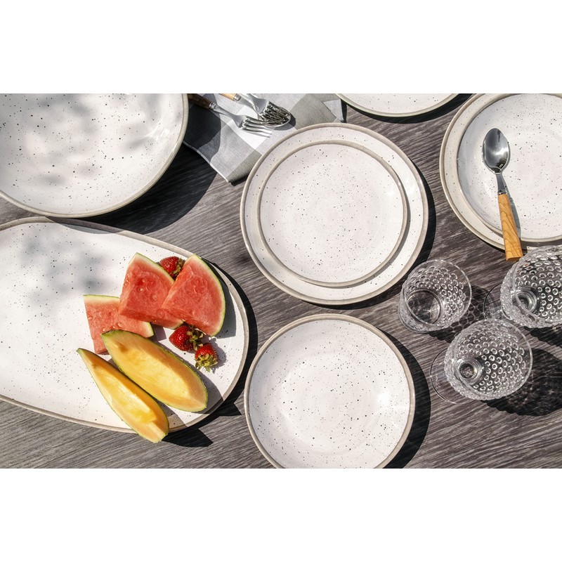 - Retreat Pottery pattern set of 6 dinner plates with white and tan finish with the look of speckled stoneware, but is actually bamboo and melamine made of Merge material; set the scene for sustainable living, each plate 10.5" diameter