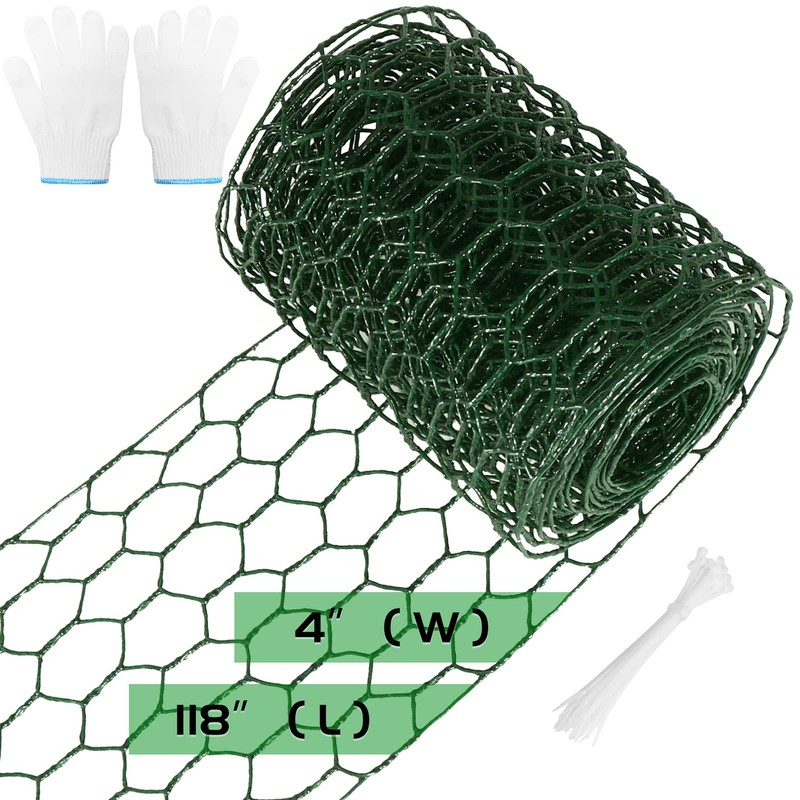 Aboofx Green Chicken Wire Mesh, 118 x 4 inch Chicken Wire Craft, Hexagonal PVC Coated Galvanized Iron Wire for Floral Arrangements, with 20 Zip Ties and 1 Pair of Glove