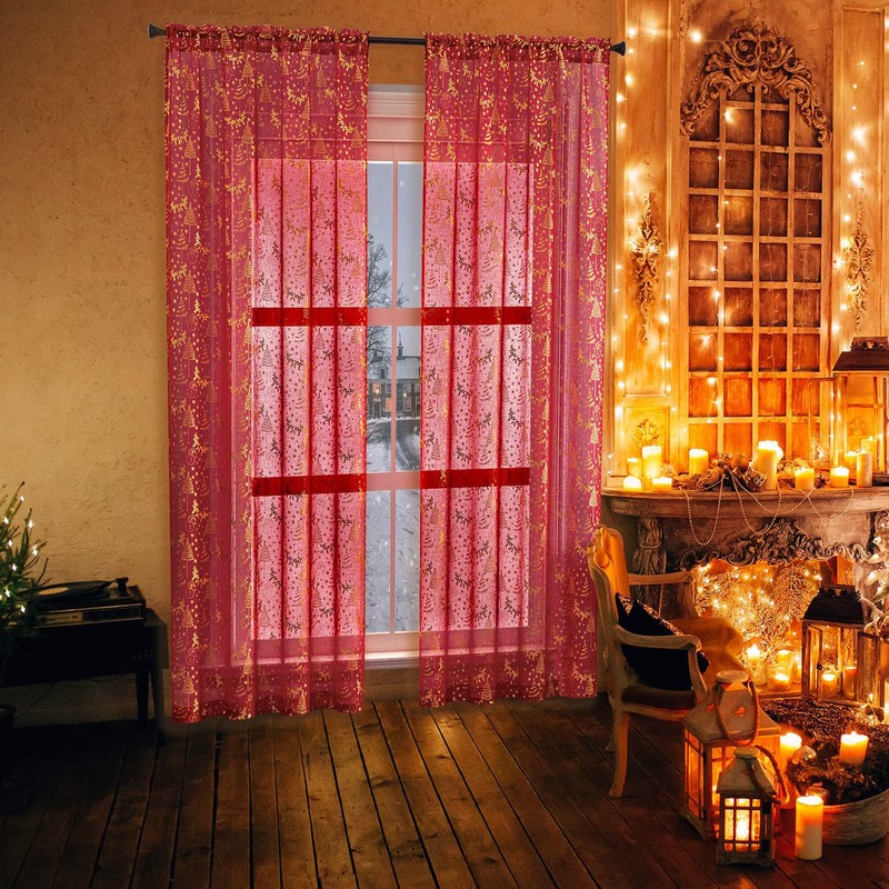 ABREEZE Christmas Decor Curtain 2panels Semi-Shading Rod Pocket Curtain Red Curtain with Christmas Tree Pattern Curtains for Living Room Bedroom42”x96”