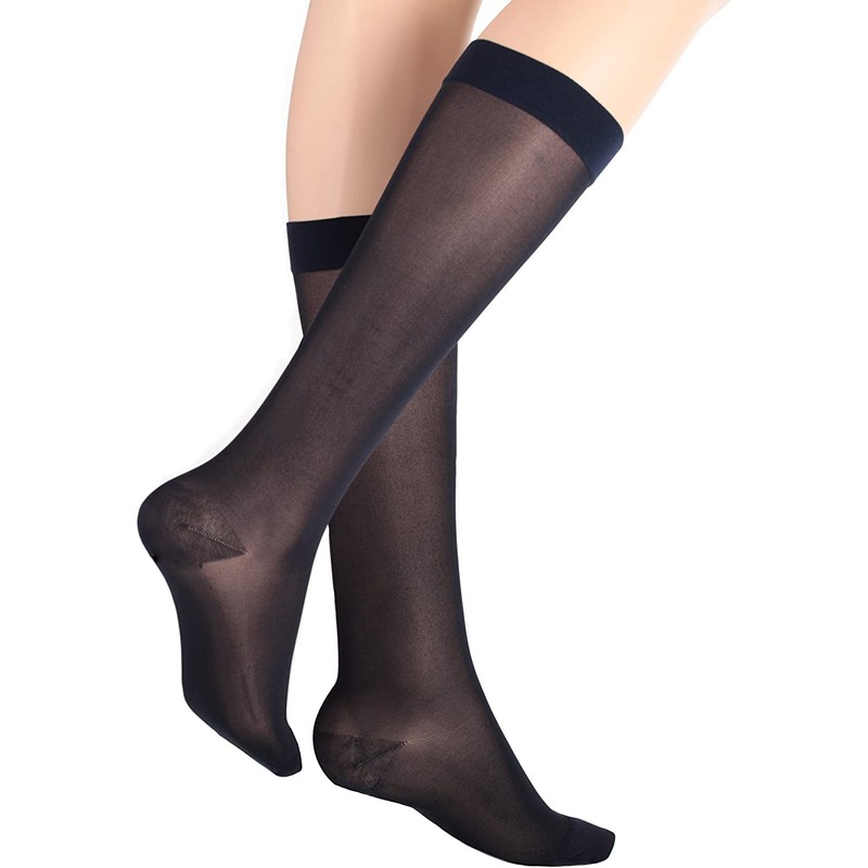 - 15-20 mmHg Compression Medium Support. Fashionable sheer fabric. Reinforced Heel and Toe.2 Inch Comfortable Soft Top Band. Looks and feels like regular knee hi fashion hose. Great quality Minor varicosities, ankle, leg and foot swelling.