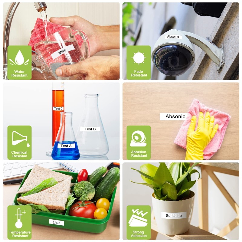 - Advantage --- Absonic Tapes with Easy Split Backing; PV-Resustant, Waterproof, Rub-Resistant, Corrosion-Resistant, Fade Resistant, Great for labeling your office files or household products.