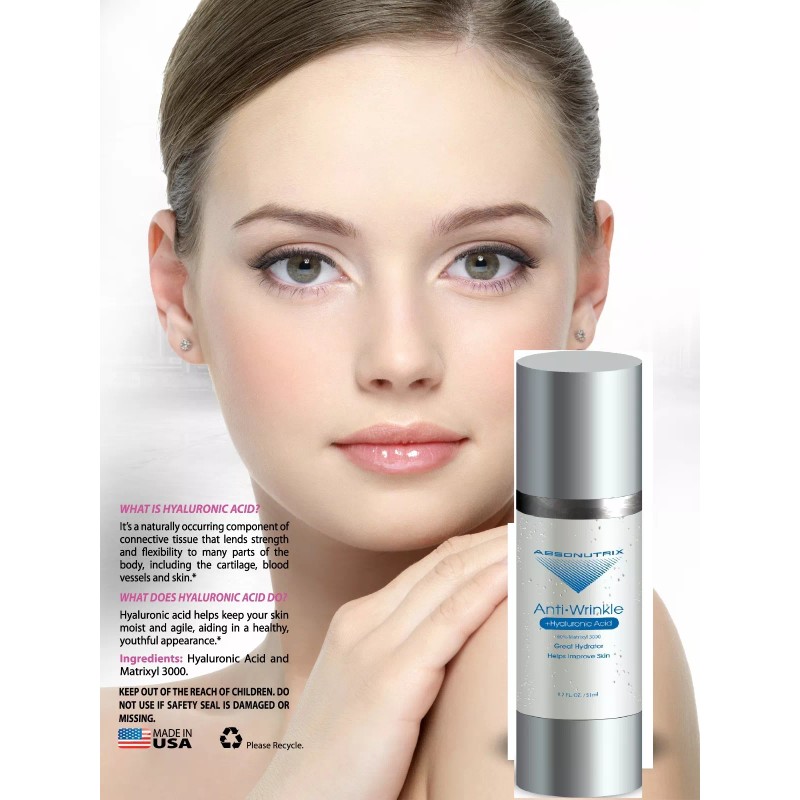 Absonutrix Anti-Wrinkle with Hyaluronic Acid and Matrixyl 3000 1.7 Fl Oz Absonutrix Anti-Wrinkle serum contains Hyaluronic acid and 60% Matrixyl 3000. Each bottle of Absonutrix Anti-wrinkle serum contains 1.7 Fl Oz of serum made with all natural ingredients. Absonutrix Anti-wrinkle serum helps erase fine lines and wrinkles and is suitable for all skin types. This product is made and packed USA. For external use only | |