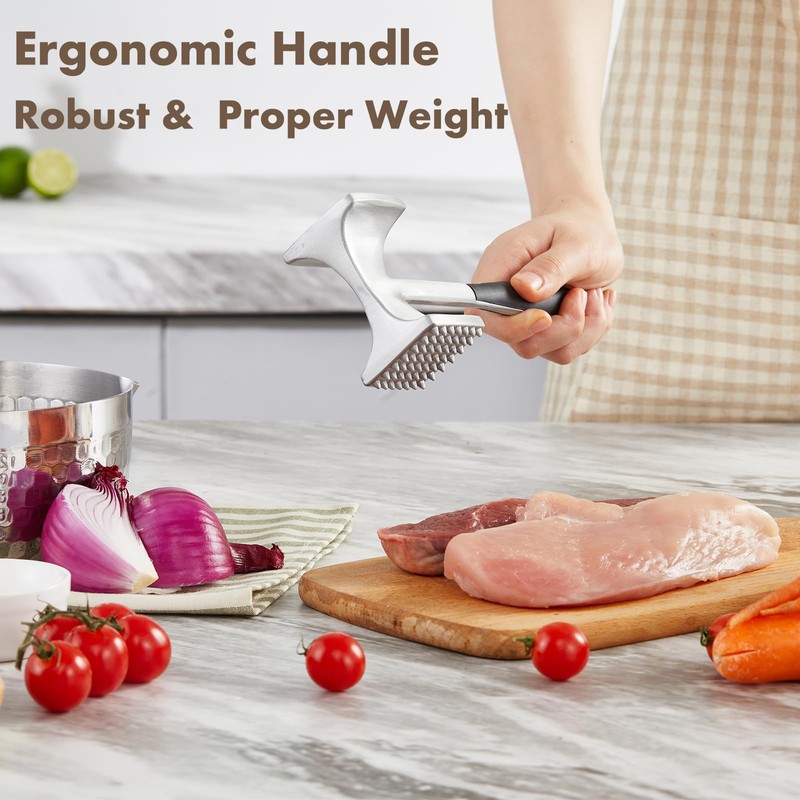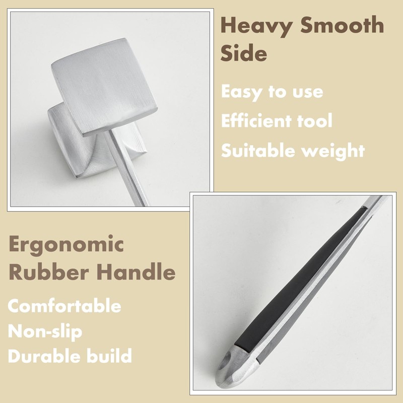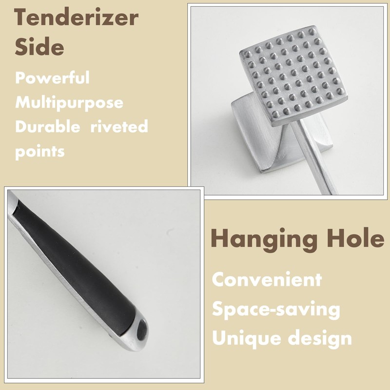 - Texturized & Smooth Surface: This versatile meat tenderizer tool features a dual-sided design. One side of the meat mallet is textured with riveted points, ideal for tenderizing tough cuts like chicken, beef, or pork. The smooth side acts as a meat pounder, flattening meats evenly for consistent cooking. Whether used as a meat masher or meat chopper, this meat tenderizer mallet handles all your culinary needs, from tender steaks to delicate cutlets.