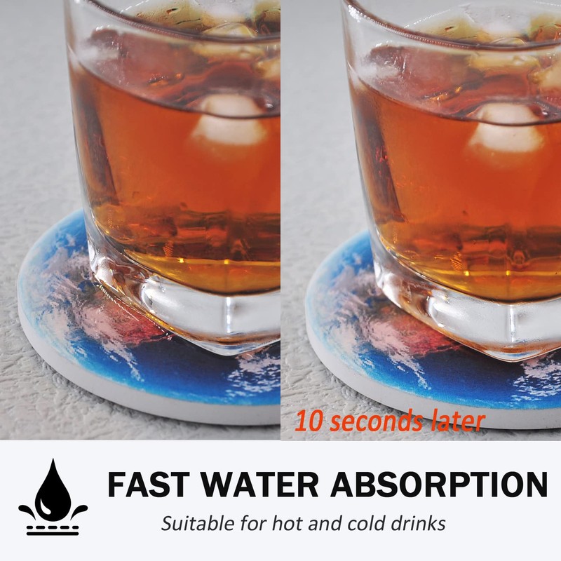 - Amazing Water Absorbency - our drink coasters are made of special absorbent ceramic stone, more absorbent than sandstone, absorb the water drip, pills or condensation from cold in a visible speed, these thirstystone coasters keep your desktop dry and clean, and do not stick to your glass