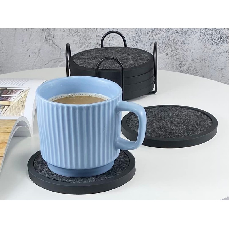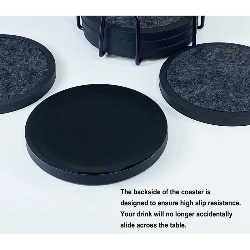 - What You Get: 6 non-slip silicone drink coasters(round, black, 4.3 inch), 6 absorbent felt inserts(round, gray) and a 4.5-inch metal holder(black). The silicone coasters can be used alone, or with the inserts. Fits all types of bottles/cups/mugs/tumblers