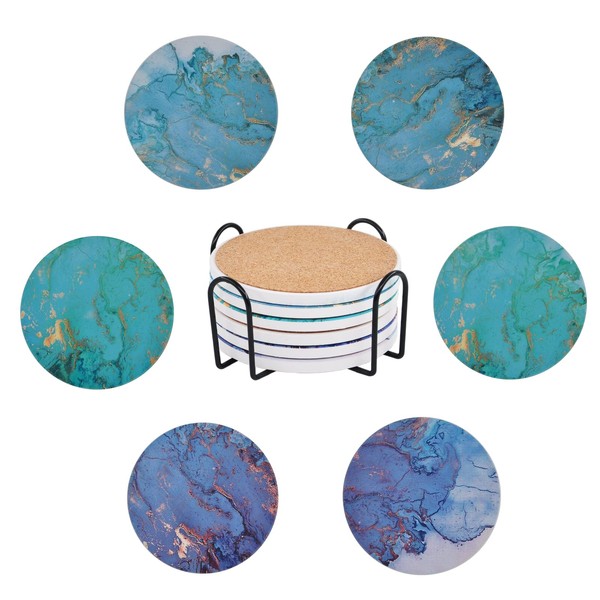 Absorbent Drink Coasters Set of 6, Blue Ceramic Coasters Cork Backing with Holder for Drinks