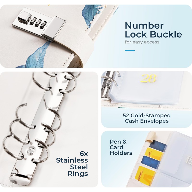 - 💲 Two Stunning Options: this money book is available in 2 versions: the "Leafy Blues" with number locks and a printed design, and the "Beige Chic" with a magnetic U buckle for neutral lovers.