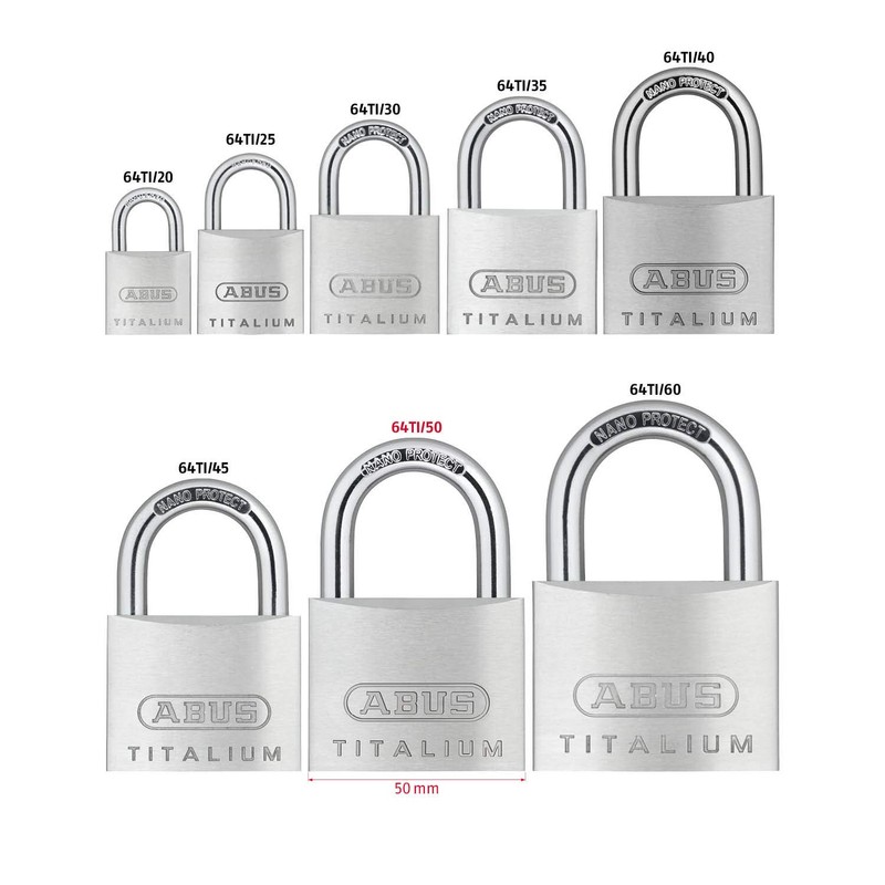 The Abus new generation of padlocks , strong, lightweight and innovative. TITALIUM is based on a special aluminium alloy, a mixture of materials is created that is extremely durable and lightweight; similar to the process used in aircraft construction. This contemporary product implementation is also reflected in the product design - all the locks in the TITALIUM series feature an impressive stainless steel like finish. Compared to classic brass padlocks, the locks in the TITALIUM series are around 30% lighter but feature the same level of security making them excellent value for money. Ideal for medium to high risk of theft, the 64TI series TITALIUM padlocks is recommended for a wide range of security requirements. All models in this series have a paracentric keyway, chrome plated cylinder cores and hardened steel shackle. Hardened steel shackle 20mm & 25,mm, ideal for luggage security 30mm & above feature through hardened steel shackle. NANO Protect shackle coating assures security & high corrosion resistance.