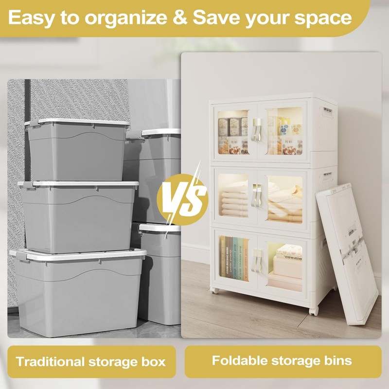 Abyssaly 33QT Stackable Storage Bins with Lids, 4 Tier Collapsible Closet Organizers and Storage, Plastic White Storage Boxes with Wheels, Double Doors for Home Office Dorm