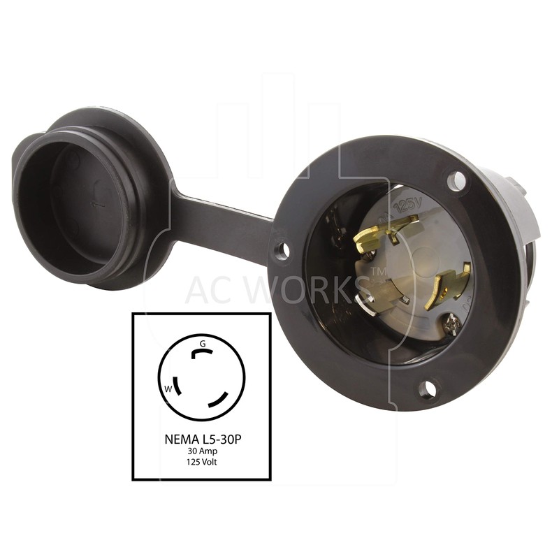This AC WORKS brand inlet wiring device is a heavy-duty power input connection device with weather cover. L5-30 Inlet is used for an industrial and commercial grade flange inlet. This inlet works with 10 AWG (American Wire Gauge) copper wire and is commonly used for boats, RV's and small trailers or cabins, residential, transfer switch and generators. Note: 18 Gauge is for 10 Amp, 16 Gauge is for 13 Amp, 14 Gauge is for 16 Amp, 12 Gauge is for 20 Amp. California Residents: See Proposition 65 Information Residential, Generator, Transfer Switch and Cabin Power Inlet 30 Amp, 125 Volt Inlet NEMA L5-30P Locking Power Inlet UL and C-UL Certified 1-Year Limited Warranty
