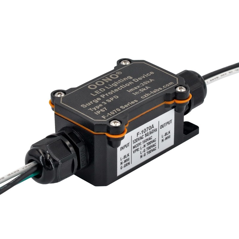 - F-1070A thermally protected surge protection device specially designed to be used in outdoor, commercial, and industrial LED lighting fixtures. It utilizes T-MOV thermally protected varistor technology which acts as a self-protector, helping prevent end-of-life issues related to varistors as well as issues related to sustaining over-voltage conditions. High line-to-earth/ground resistance.