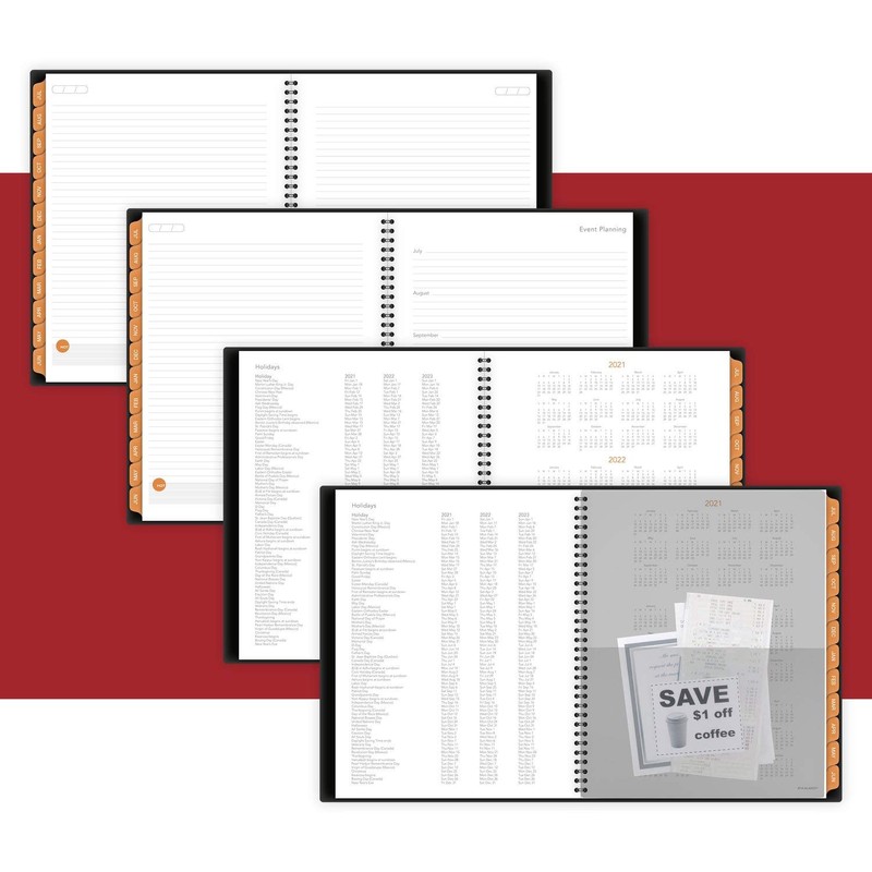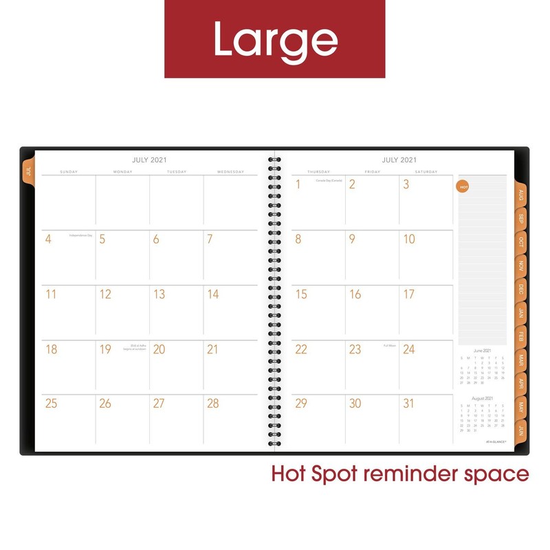 - TABBED MONTHS – Perfect for long-term planning, each month covers a two page spread. Features unruled daily blocks for free-form scheduling, HOT Spot reminder area and past/future calendar blocks.