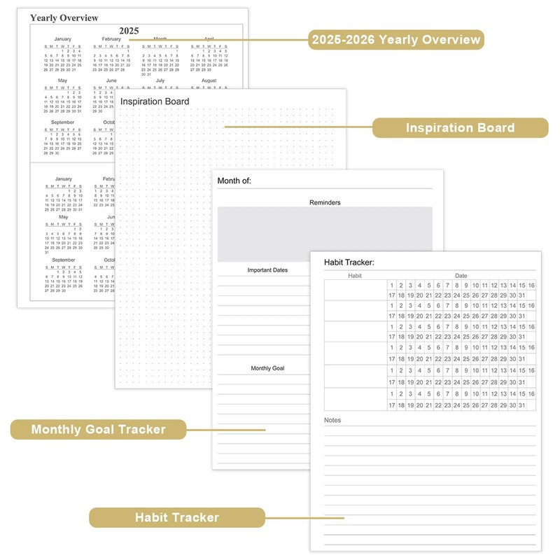 Inner Page: Yearly Overview | Personal Information | Contacts | Goals page | Class Schedule | Inspiration Board | Project Plan | Monthly Page | Habit Tracker | Weekly Page | Grade Tracker | Notes Page |
