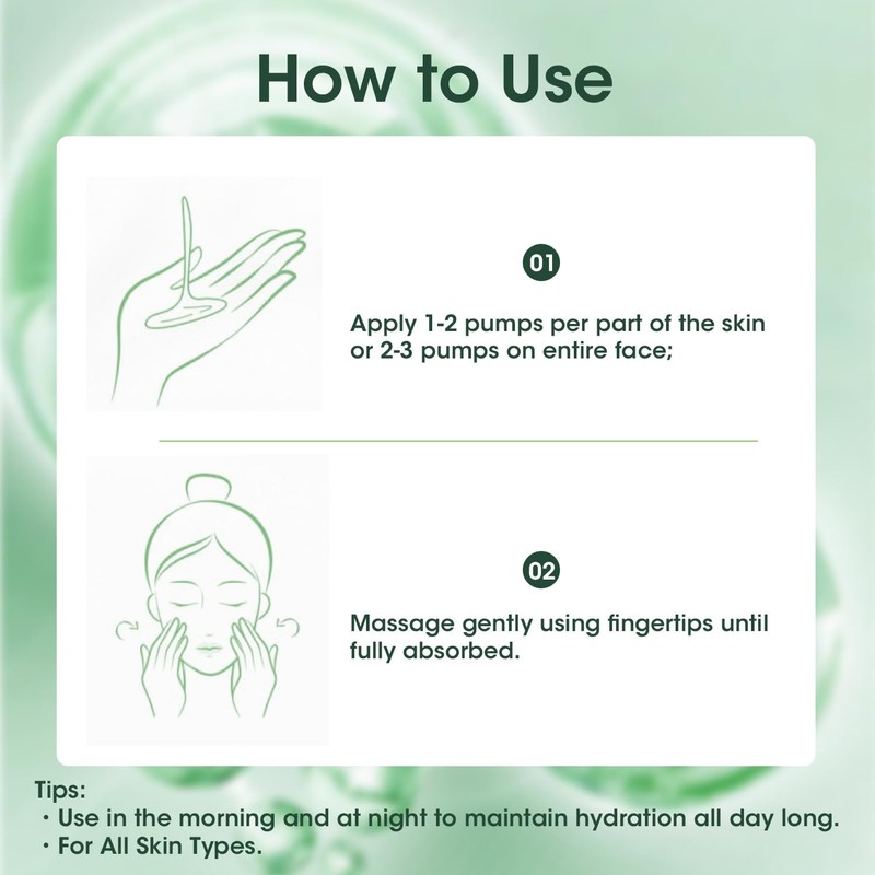 • [Absorb Fully] Use 1~2 pumps per part of the skin. Massage gently until fully absorbed in a few seconds. It has a light slightly grassy scent.