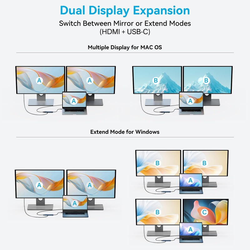 - 【Multiple Dual-Screen Modes For You To Choose】The laptop docking station Support MST and SST dual display①Windows system supports MST and SST (Mirror mode A-A-A and Extend mode A-B-C/ A-A-B/ A-B-B). ②MacOS supports Mirror mode: A-A-A and Extend mode: A-B-B. (A/B/C refers to the display number). There are no restrictions on the system chip for your Mac.