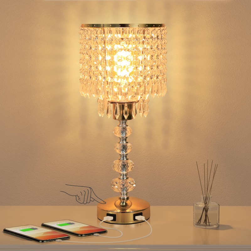 Acaxin Crystal Table Bedside Lamp Touch Control, 3-Way Dimmable Small Nightstand Lamp with 2 USB Charging Ports, Decorative Gold Tabletop Lamp for Bedroom, Living Room and Guest Room