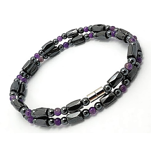 This fashionable natural stone magnetic necklace features a hematite with a glamorous shine and amethyst that enhances your love luck.
