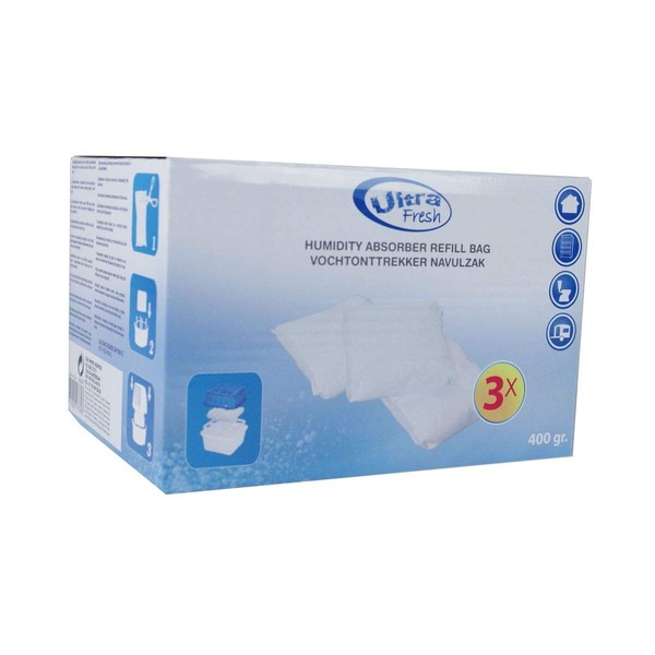 Model: refill pack material: granules content: 3 x 400 g. Can be used in bathrooms, living rooms, caravans and cupboards for ultra fresh room dehumidifier prevention against mould, corrosion and musty odours. Granules: calcium chloride dihydrate-ecological, works without additional energy supply