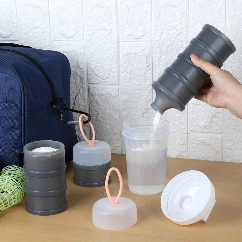 - Capacity - 4 layers design, each layer can contain 4 oz. You can put quantity of protein powder to be taken at one time in each layer compartment, and totally carry 4 times of protein powder for outdoor need, very convenient and practical.