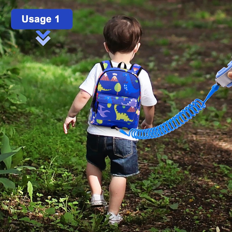 - 4 Ways to Use: ⑴ Child can wear it as a backpack. ⑵Dinosaur backpack + leash. ⑶ Dinosaur backpack + wrist link. ⑷ anti-lost wrist link. With this backpack with wrist leash, you don’t have to worry that your curious kid will wander lost.
