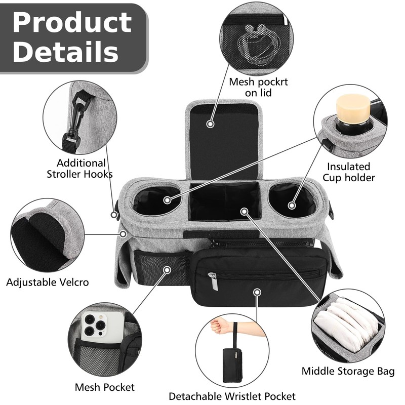 - Multiple Usage Methods : It can be hung as a stroller cup holder organizer on the stroller. When you don't need to use a stroller, you can also install the accompanying strap and carry this organizer bag for easy outing.