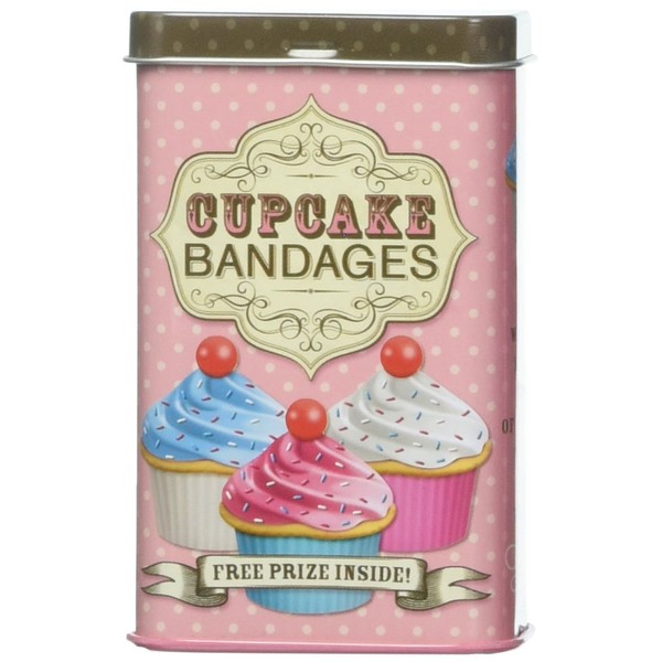 Cupcakes are the cure-all that can conquer your cuts and contusions. Each 3-3/4" (9.5 cm) tall metal tin contains twelve 1-3/4" x 1-1/2" (4.4 cm x 3.8 cm) latex-free adhesive bandages with sterile gauze and a FREE PRIZE to take your mind off of the excruciating pain.