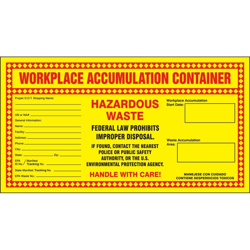 Accuform MHZW22PSC Adhesive Coated Paper Hazardous Waste Label, Legend "WORKPLACE ACCUMULATION CONTAINER - HAZARDOUS WASTE FEDERAL LAW PROHIBITS IMPROPER DISPOSAL...HANDLE WITH CARE!", 6" Length x 11"