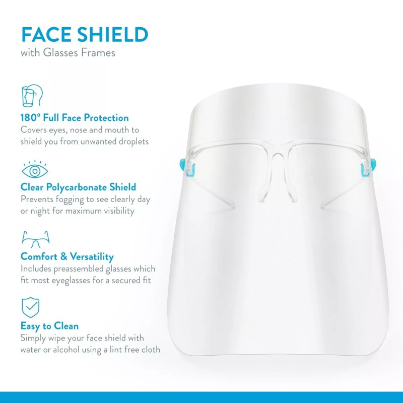 - 1-count of glasses frames (reusable) packed together with 1-count of fully transparent face shields.