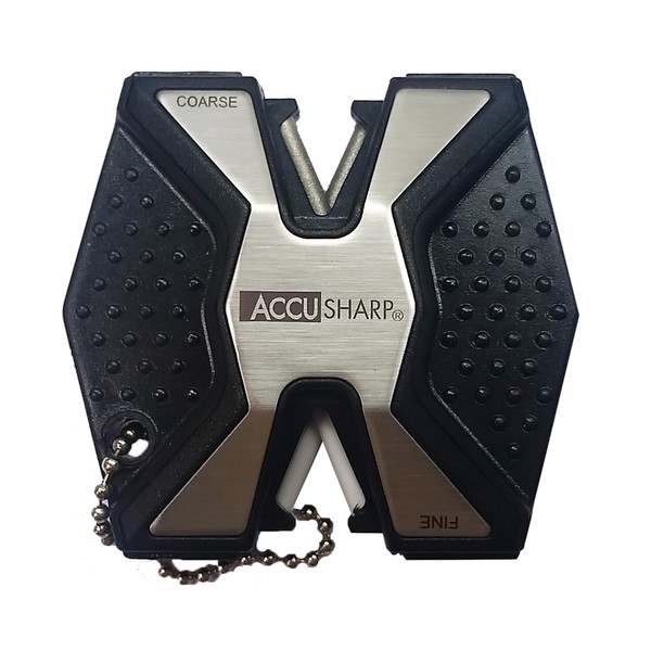 The AccuSharp diamond Pro 2-step knife sharpener features pre-angled coarse diamond and fine ceramic rods to sharpen, restore, and then polish a blade's edge. One of our newest "Award winning" designs, the diamond rods are aggressive enough to sharpen all types of steel. The flip side consists of two ceramic rods used to finish and polish the edge for a smooth, sharp finish. The diamond Pro 2-step exterior is made of brushed aluminum and finished with a rubber molded grip and rubber feet for safety. The unit has a lanyard hole which allows for easy attachment to cord or string.