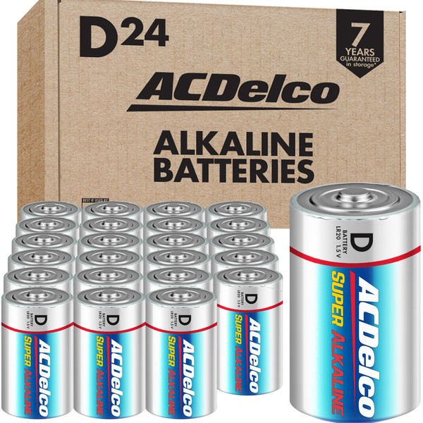 ACDelco D size Super Alkaline Batteries are equipped with advanced technology you can count on. ACDelco alkaline batteries perform better than the competition in high-drain and super high-drain devices, and they provide consistent discharge performance. ACDelco alkaline batteries are designed for long shelf-life with stainless steel pre-coating that prevents leakage and advanced ingredient formulation that helps maintain power over time. This recloseable storage pack includes 24 size D cell batteries that are great for a variety of household devices, including flashlights, toys, fans, clocks, musical instruments, and more. The 1.5-volt batteries contain no mercury or cadmium, making them a smart choice for your family and for the environment. A trusted national brand, ACDelco offers a wide variety of batteries you can count on, including alkaline batteries, lithium coin cell batteries, rechargeable batteries, and car batteries.
