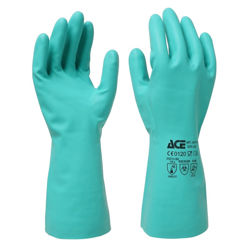 - Main Applications: Handling various chemicals in the pharmaceutical factory, degreasing, solvent work in automotive factories, manufacturing agriculture, pesticide spraying, metal processing, ink and glue, (Material) Surface: Nitrile rubber (NBR), Back = Cotton (spraying); Surface treatment: Reverse diamond-shaped grip treatment; Color: Green; Sizes: S/M / L LL (EN Standard) EN374 Standards: EN ISO 374-1:2016 TYPE A (AJKLOT), EN ISO 374-5:2016, EN388 Standards: 4101X; Quantity: 1 pair