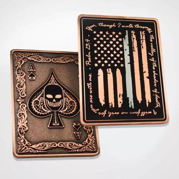 This Ace of Spades, card shaped coin is sure to be one of the most unique additions to any collection. The front of the card features the grinning skull spade design with intricate detailing. The back of the coin is wrapped with the text "Psalm 23:4 - Yea, though I walk through the valley of the shadow of death, I will fear no evil for you are with me." around a high contrast, USA flag against shiny black enamel. SA
