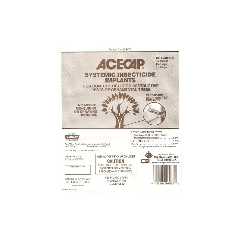 Acecap 3/8" systemic insecticide tree implants contain 98.9% Acephate for control of many tree pests including aphids, borers (including Emerald Ash Borer), gypsy moths, bagworms, webworms, budworms, cone worms, maple worms, oak worms, cankerworms, casebearer, citrus blackfly, tent caterpillar, elm leaf beetle larvae, honey locust mite, lace bug, leaf folder, leaf miner, Nantucket pine tip moth larvae, pine needle miner, scale (crawlers), thrips, whitefly, wooly adelgid and Zimmerman pine moth. One treatment provides season-long pest control in deciduous trees and up to two years control in evergreen trees. For use in ornamental trees only, with a diameter of at least 3 Inch. Not for use in edible fruit and nut trees or flowering crabapple trees. These small plastic implants contain dry-powder chemical that is double-encapsulated, meaning no exposure to the applicator or the environment. Acecaps are easily installed by tapping the implants with a hammer and bolt or dowel rod into pre-drilled 3/8" diameter holes in the lower tree trunk at 4 to 6 inch spacing. The cartridge head securely plugs the small wound made to the tree trunk and the active layer of cambium will soon grow over and close the implant site. Under normal moisture conditions, the chemical will move throughout the entire tree within 3 to 4 days for quick control. 10 Acecaps will treat a 14 inch diameter tree.