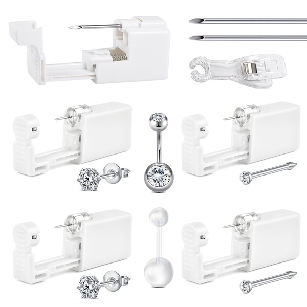 - Self piercing gun kit include - 1pair ear piercing gun with earrings + 1pair nose piercing gun + 1piece belly button piercing kit avoid piercing bump+ 1 piercing assist clamp + 2 belly button rings + 2piece Body Piercing Needles