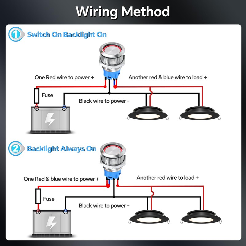 This SPST switch features a red illuminated ring light, with backlight options for always on or active-only modes. Pre-soldered leads ensure easy, durable connections, while its stainless steel, IP64-rated design offers rugged reliability in harsh environments. Simple to install with a 3/4" (19mm) hole, it’s perfect for RVs, boats, trucks, motorcycles, and DIY projects needing robust, dependable switches.