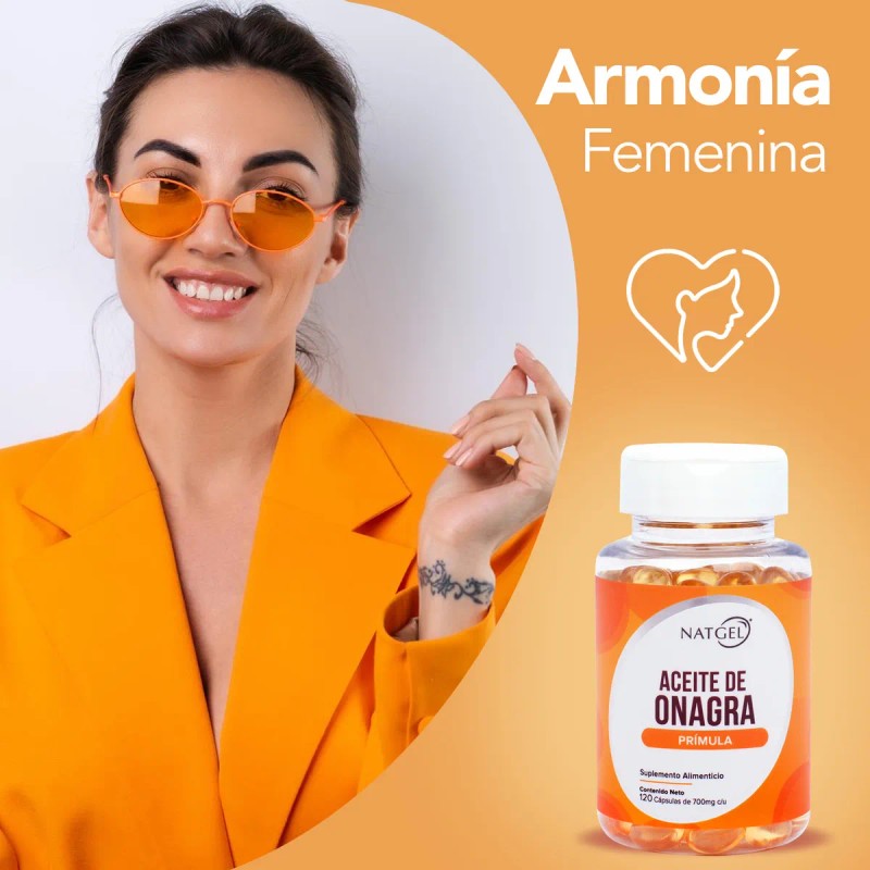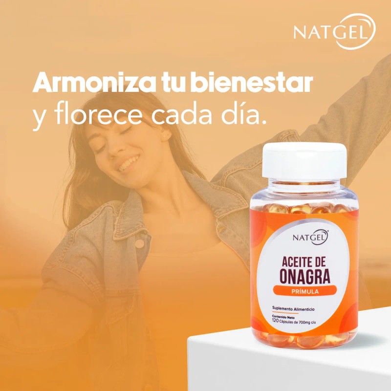El Aceite de Onagra Natgel (también conocido como aceite de prímula) es un suplemento natural extraído de la semilla de la planta Oenothera biennis, rico en ácido gamma-linolénico (GLA), un ácido graso esencial Omega 6. Este compuesto ha sido estudiado por su efecto positivo en el equilibrio hormonal, el ciclo menstrual, la salud de la piel y el bienestar general de la mujer.
