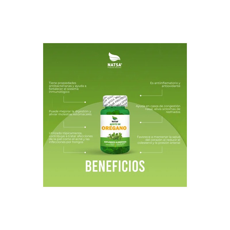 Este suplemento natural es reconocido por sus propiedades antimicrobianas, antioxidantes y antiinflamatorias. Cada cápsula contiene aceite de orégano 100% puro, rico en carvacrol, el componente activo responsable de sus múltiples beneficios para la salud. Es ideal para fortalecer el sistema inmunológico, mejorar la digestión y combatir infecciones de forma natural.