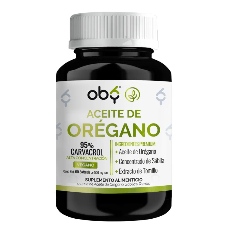 - Aceite de Oregano 95% Carvacrol de Oby en cápsulas blandas vegetales es la forma más práctica, segura y concentrada de aprovechar las propiedades del orégano mediterráneo. Su fórmula premium desarrollada por expertos, combina aceite de orégano de alta pureza, tomillo, sábila y aceite MCT para favorecer el bienestar digestivo, el equilibrio intestinal, el confort respiratorio y la defensa antioxidante. Cada frasco incluye 60 cápsulas blandas 100% naturales de grado alimenticio de aceite de orégano (oil of oregano) libres de azúcar, gluten y lácteos, ideales para quienes buscan un aliado natural de uso diario. ¿QUÉ ES EL ACEITE DE ORÉGANO? El aceite de orégano en cápsulas es un suplemento natural reconocido en la herbolaria mediterránea por su alto contenido en carvacrol, un compuesto estudiado por su efecto antioxidante y su uso tradicional como antifúngico natural. Al combinarse con tomillo, sábila y MCT, OBY ofrece una fórmula avanzada que potencia la absorción y multiplica los beneficios para tu bienestar general. FÓRMULA PREMIUM 100% NATURAL Aceite de Orégano 95% Carvacrol: Extracto de máxima concentración con propiedades antioxidantes y antifúngicas tradicionales. + Tomillo: Reconocido por siglos como apoyo natural para la función respiratoria. + Sábila: Favorece la digestión y el equilibrio intestinal. + Aceite MCT: Potencia la absorción de compuestos activos para mayor eficacia. + IDEAL COMO PARTE DE TU ESTILO DE VIDA SALUDABLE El Aceite de Orégano de Oby es una excelente opción para quienes integran a su rutina productos como Probióticos, Proteína, Candida Cleanse y Omega 3, en su día a día. Su perfil antioxidante y digestivo lo convierte en un gran complemento para una rutina enfocada en el bienestar integral. PUREZA DE LA MÁS ALTA CALIDAD Y TECNOLOGÍA: Sin rellenos Sin azúcar, Sin gluten, Sin lácteos 100% Vegana | No GMO Fabricado en laboratorios con buenas prácticas de manufactura (GMP) y estándares de calidad internacional. CONTENIDO: 60 cápsulas blandas (2 meses de uso) MODO DE USO Tomar 1 cápsula al día de preferencia con alimentos. OBY – EL SECRETO ESTÁ EN EL BALANCE. Nota: ESTE PRODUCTO NO ES UN MEDICAMENTO. EL CONSUMO DE ESTE PRODUCTO ES RESPONSABILIDAD DE QUIEN LO RECOMIENDA Y DE QUIEN LO USA. MANTENGASE EN UN LUGAR FRESCO Y SECO. Aviso legal