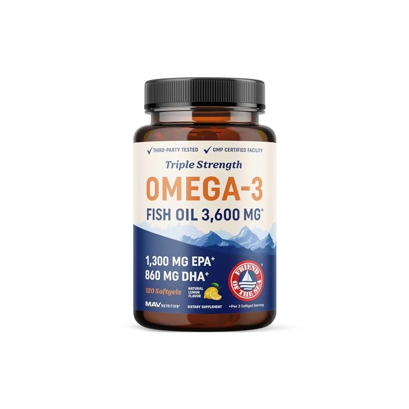 El Fish Oil de triple potencia de MAV Nutrition ofrece una cantidad super concentrada de ácidos grasos esenciales. Cada porción contiene 1296 mg de EPA y 864 mg de DHA. Los ácidos grasos en nuestras cápsulas contribuyen al mantenimiento de articulaciones, ojos y cerebro saludables, además de otros beneficios. Este suplemento proporciona 3,600 mg de aceite de pescado por porción, obtenido exclusivamente de peces silvestres de pesquerías sostenibles certificadas por Friend of the Sea. Nuestro fish oil no transgénico es altamente refinado mediante destilación molecular, un método que mejora la pureza y reduce al mínimo la presencia de mercurio, metales pesados, PCB y otras toxinas. Además, nuestras cápsulas de gel suave están diseñadas para evitar el sabor a pescado y están infusionadas con un refrescante sabor natural a cítricos, haciéndolas fáciles de consumir.