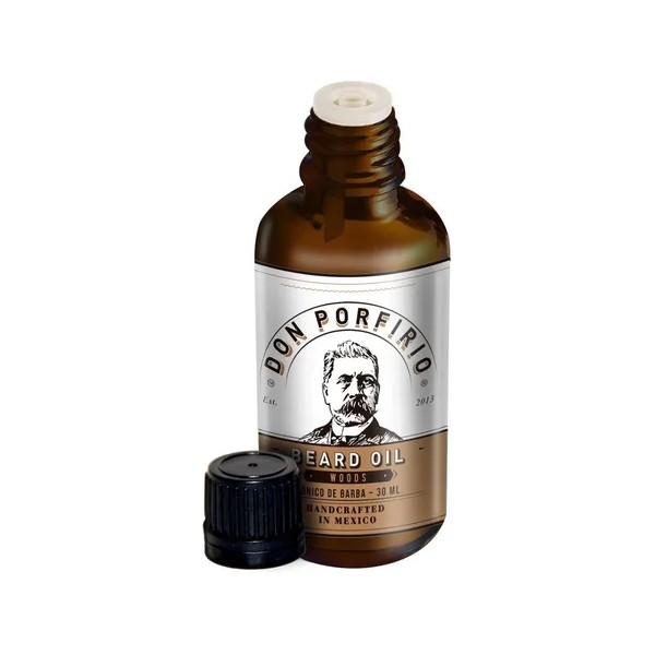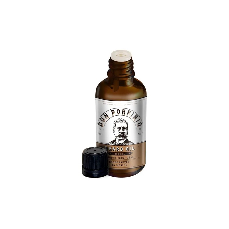 - Aceite para barba 'Woods' 30ml de Don Porfirio, proporciona hidratación y suavidad con un aroma masculino y sofisticado.